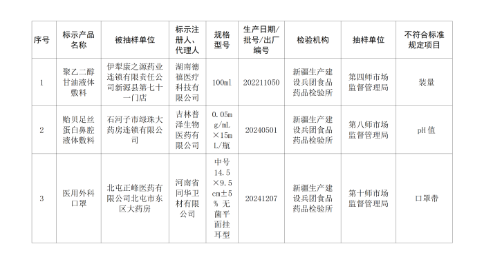 ??? 根據兵團2025年醫療器械質量監督抽檢工作計劃,兵團藥監局組織對轄區醫療器械生產、經營企業和使用單位的醫療器械進行了監督抽檢,現將3批次抽檢結果不符合標準規定的醫療器械及有關情況予以公告(見下表)。對于公告中抽檢結果不符合標準規定醫療器械涉及的相關單位,已依據有關法律法規采取風險控制措施,予以查處。